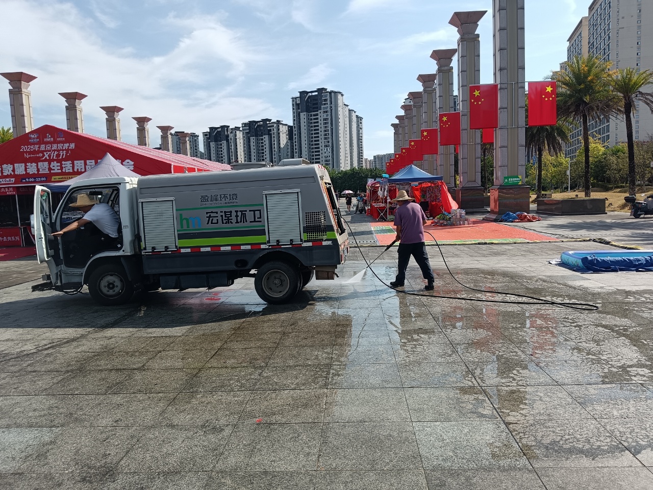 現(xiàn)場(chǎng)清潔:環(huán)衛(wèi)清洗車每日早晚高壓清洗地面,清除油污污漬,保障環(huán)境整潔。